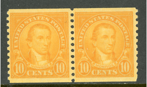 USA 1924 Monroe 10¢ Orange Coil Pair Perf 10 Vert Scott #603 MNH A398