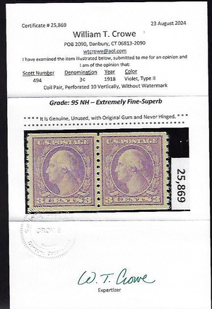 WCstamps: U.S. Scott #494 3c Type II Coil Pair 2024 Crowe Cert SMQ $475