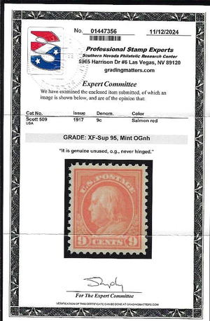 WCstamps: U.S. Scott #509 / Mint OGnh 2024 PSE Cert Grade 95 SMQ $275