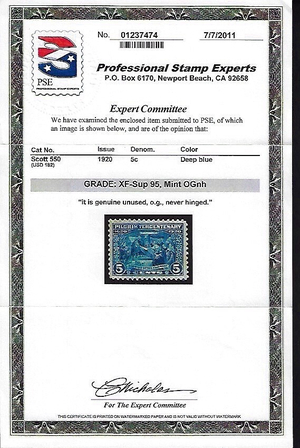 WCstamps: U.S. Scott #550 / 5c Pilgrim, XF/SUP, Mint OGnh 2011 PSE Cert SMQ $375