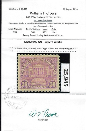 WCstamps: U.S. Scott #701 / 50c Lilac, SUP, Mint OGnh, 2024 Crowe Cert SMQ $600