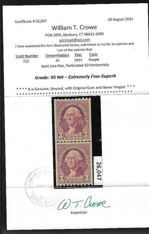 WCstamps: U.S. Scott #722 3c Coil Pair XF/SUP Mint OGnh 2024 Crowe Cert SMQ $300