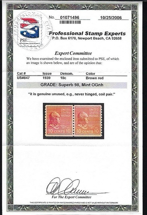WCstamps: U.S. Scott #847 10c Prexie Pair SUP Mint OGnh 2006 PSE Cert SMQ $275