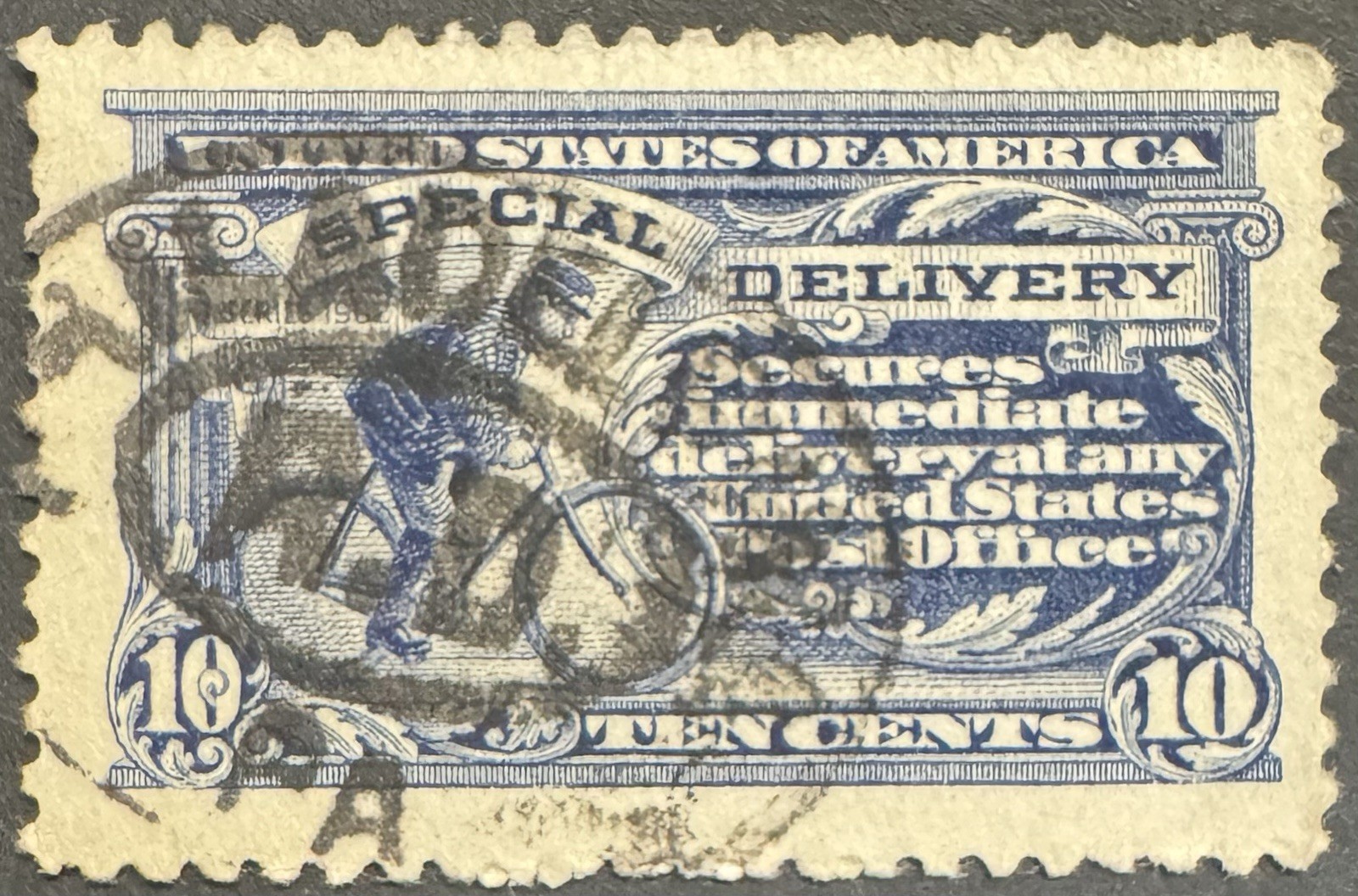 Up for sale is a 1917 U.S. Special Delivery 10¢ stamp (Scott E11) featuring the classic Messenger on Bicycle design in ultramarine blue.
