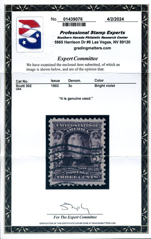 302, 3¢ Jackson, Used, PSE Cert, Exceptionally Choice