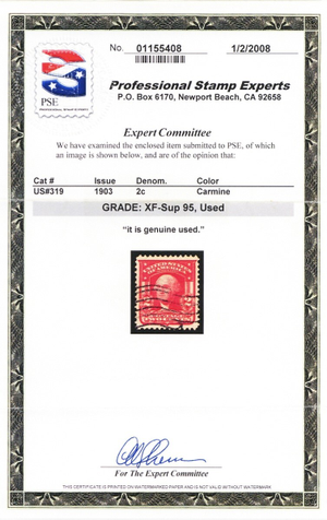 Due to the high cost of obtaining certificates we will only refund the cost of the stamp and not the cost of the certificate for stamps that sell for less than $250 that come back with a negative certificate. Stamps that sell for above $250 will receive a full refund for both the price of the stamp and cost of the certificate if it should come back not as described. For U.S. stamps only certificates from either APS, PSE or from the Philatelic Foundation are accepted, however "graded" certificates or "encased" items are not accepted.