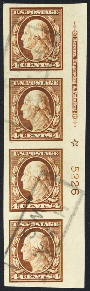 346, Used 4¢ Superb Imprint & PL# Strip of Four * Stuart Katz