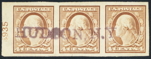 346, Used 4¢ XF Strip of Three Stamps With PL# * Stuart Katz