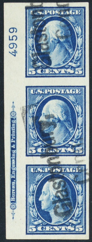 347, Used 5¢ XF PL# & Imprint Strip of 3 * Stuart Katz