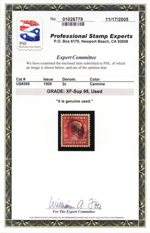 Due to the high cost of obtaining certificates we will only refund the cost of the stamp and not the cost of the certificate for stamps that sell for less than $250 that come back with a negative certificate. Stamps that sell for above $250 will receive a full refund for both the price of the stamp and cost of the certificate if it should come back not as described. For U.S. stamps only certificates from either APS, PSE or from the Philatelic Foundation are accepted, however "graded" certificates or "encased" items are not accepted.