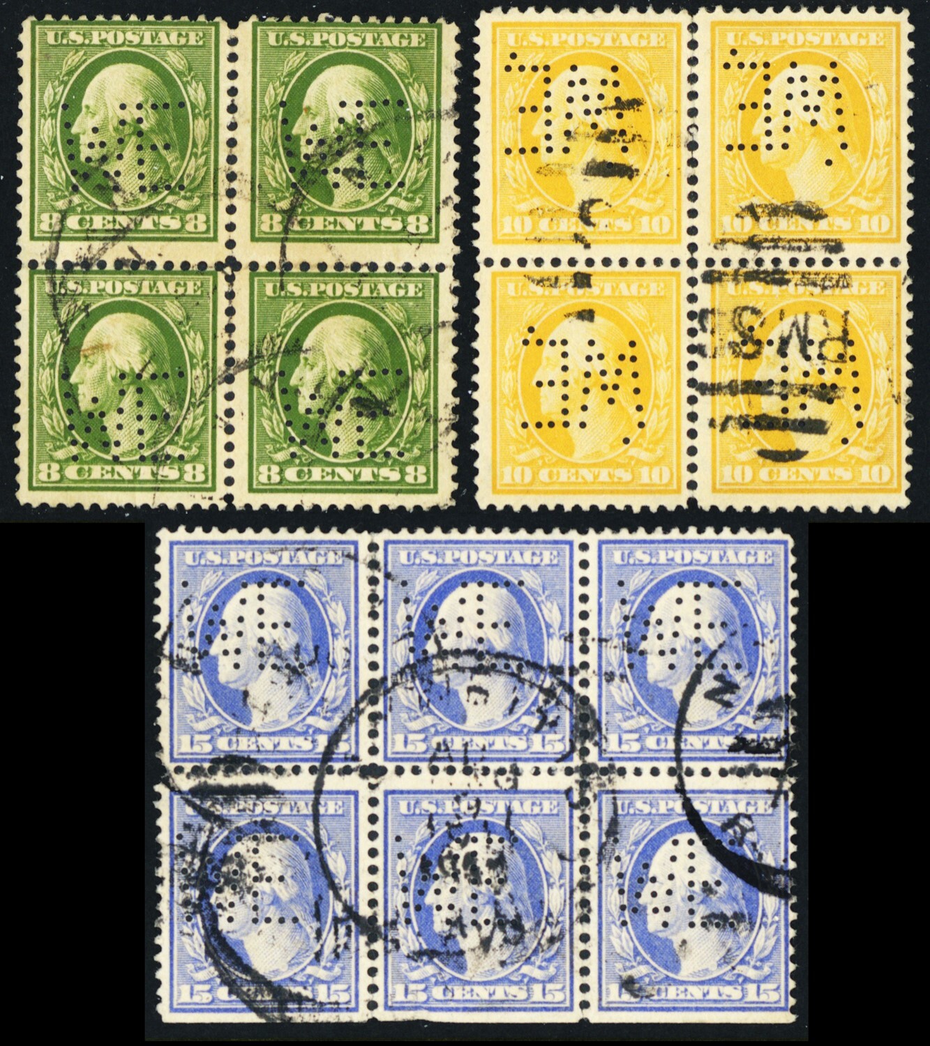 378/382, Three Used Blocks With Perfins SCV $307.50 * Stuart Katz