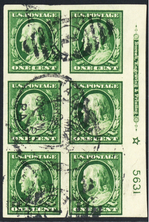 383, Used 1¢ VF Plate Block of Six Stamps * Stuart Katz