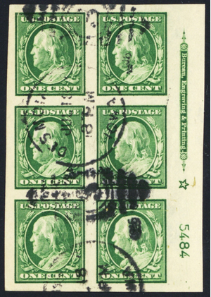 383, Used 1¢ XF (App) Plate Block of Six Stamps * Stuart Katz