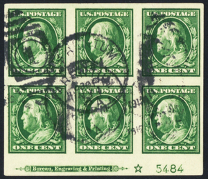383, Used 1¢ XF Plate Block of Six Stamps * Stuart Katz