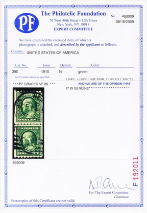 Due to the high cost of obtaining certificates we will only refund the cost of the stamp and not the cost of the certificate for stamps that sell for less than $250 that come back with a negative certificate. Stamps that sell for above $250 will receive a full refund for both the price of the stamp and cost of the certificate if it should come back not as described. For U.S. stamps only certificates from either APS, PSE or from the Philatelic Foundation are accepted, however "graded" certificates or "encased" items are not accepted.