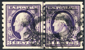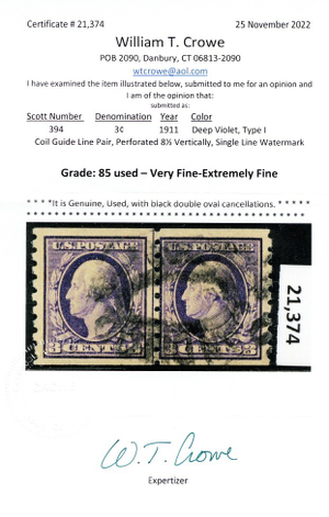 394, Used 3¢ VF Coil Line Pair With Crowe Certificate SMQ $875 - Stuart Katz