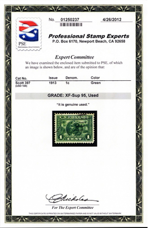 397, Used 1¢ XF/Superb - With Graded 95 PSE Certificate - Stuart Katz