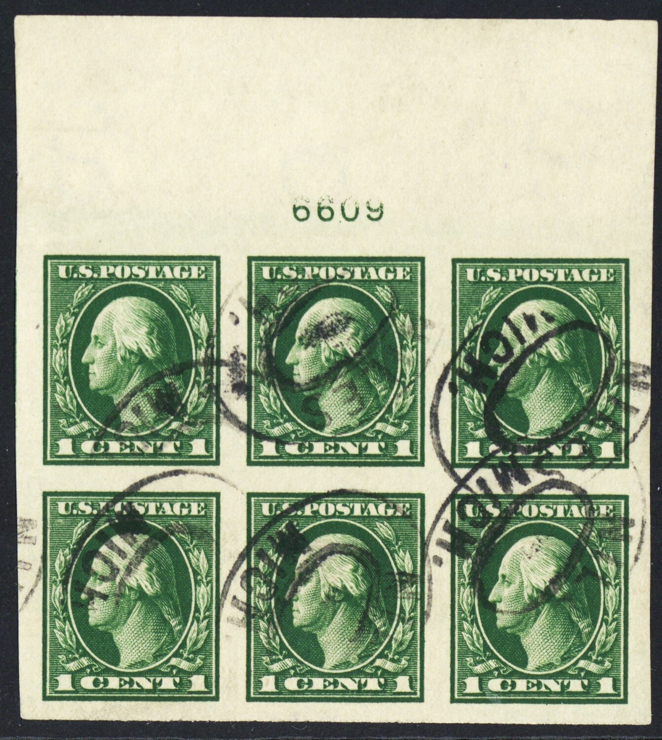 408, Used 1¢ Superb Top Plate Block of Six Stamps * Stuart Katz