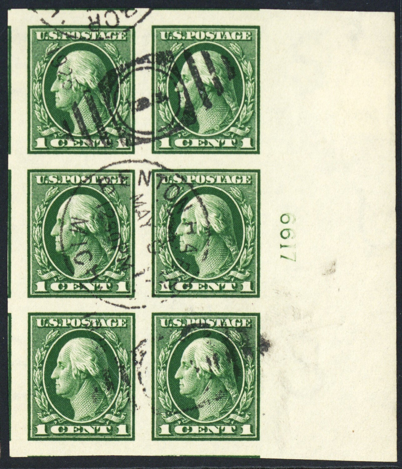408, Used 1¢ XF Right Side Plate Block of Six Stamps * Stuart Katz