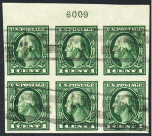 408, Used 1¢ XF Top Plate Block of Six Stamps ** Stuart Katz