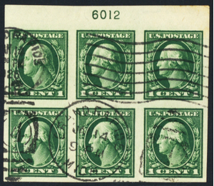 408, Used 1¢ XF Top Plate Block of Six Stamps * Stuart Katz