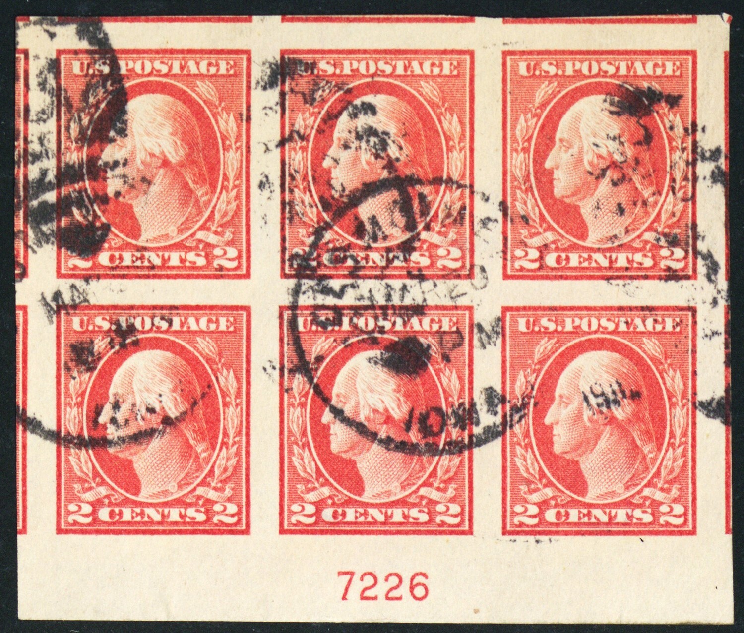 409, Used 2¢ Superb JUMBO Bottom Plate Block of Six Stamps * Stuart Katz