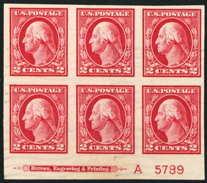 409, Used 2¢ VF Bottom Plate Block of Six Stamps * Stuart Katz