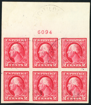 409, Used 2¢ XF Top Plate Block of Six Stamps * Stuart Katz