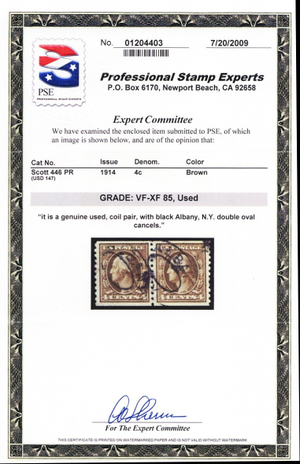 446, Used VF 4¢ Coil Pair - PSE Graded 85 Cert - Stuart Katz