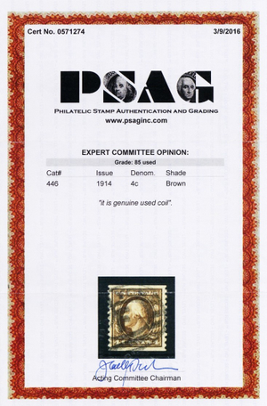 446, Used VF/XF 4¢ Coil - PSAG Graded 85 Certificate - Stuart Katz