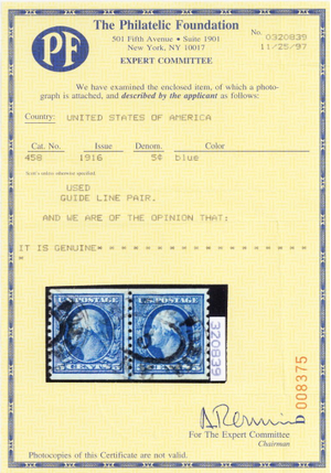 458, Used 5¢ Coil Line Pair - With PFC Certificate - Stuart Katz