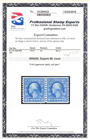 458, Used 5¢ SUPERB Coil Pair PSE Graded 98 Certificate * Stuart Katz