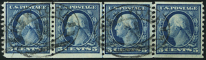 458, Used 5¢ VF RARE Coil Line Strip of 4 CV $310.00 - Stuart Katz