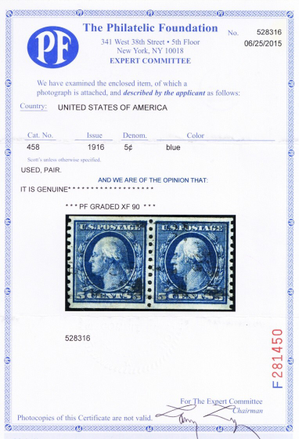 458, Used XF 5¢ Coil Pair - Graded 90 PFC Certificate - Stuart Katz