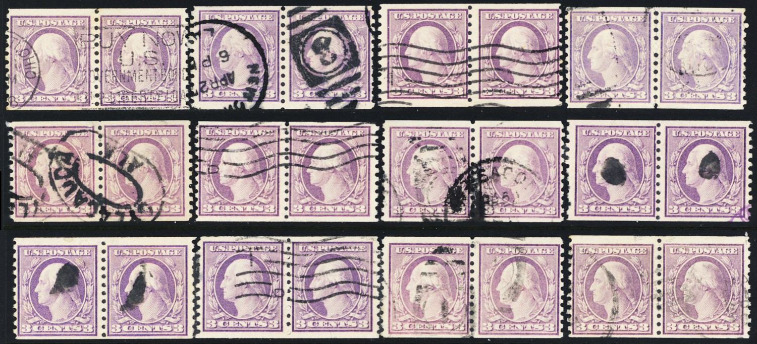 493, Used 3¢ - 12 Coil Pairs SCV $150 - Stuart Katz