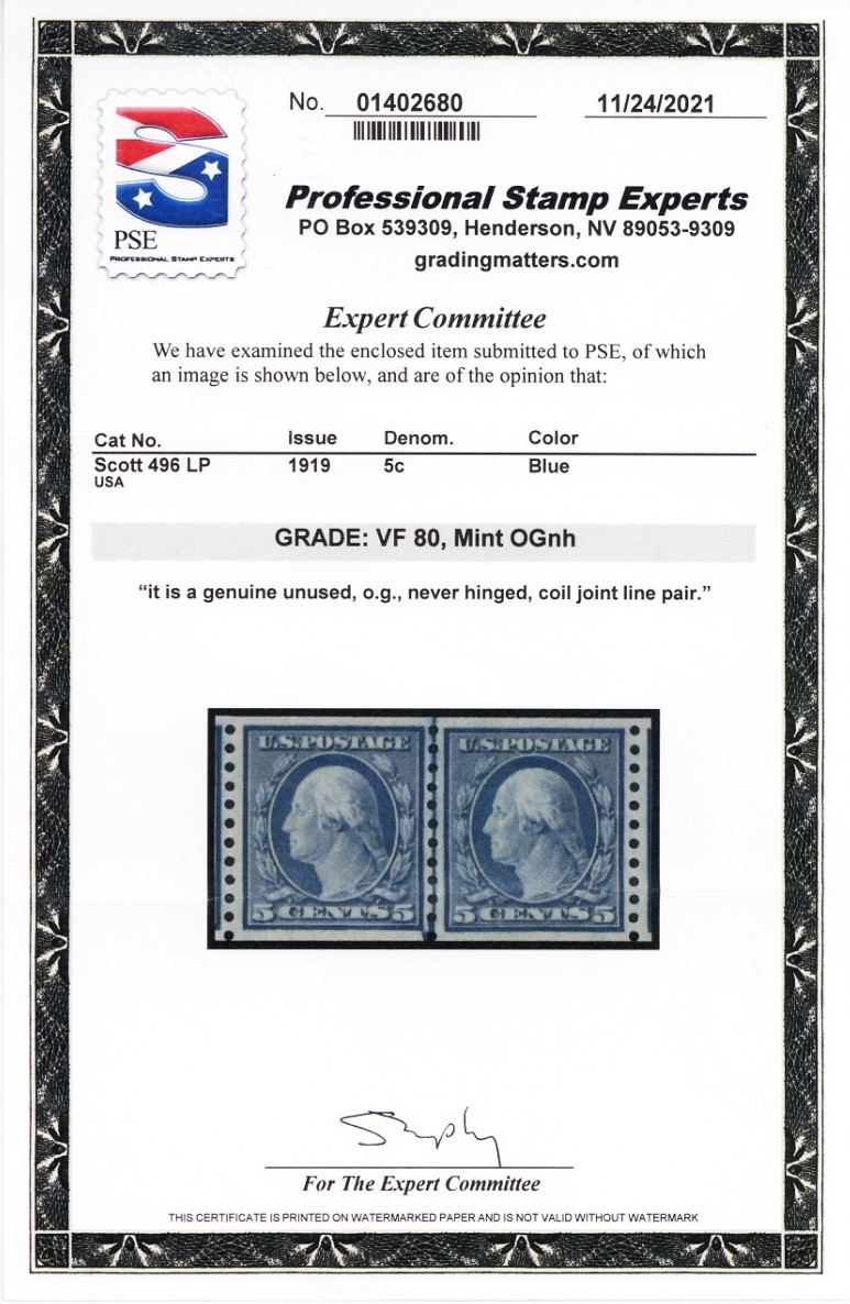 496, Mint VF NH 5¢ - Coil Line Pair With PSE Certificate * Stuart Katz
