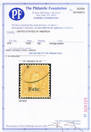 679, Used 10¢ XF Nebraska - PFC Graded 90 Certificate -- Stuart Katz