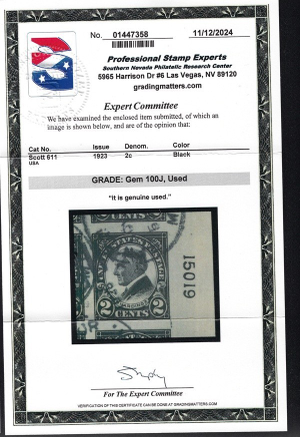 WCstamps: U.S. Scott #611 / Used 2024 PSE Cert Grade 100J SMQ $135