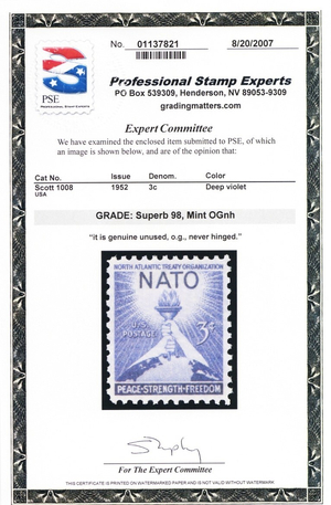 Due to the high cost of obtaining certificates we will only refund the cost of the stamp and not the cost of the certificate for stamps that sell for less than $250 that come back with a negative certificate. Stamps that sell for above $250 will receive a full refund for both the price of the stamp and cost of the certificate if it should come back not as described. For U.S. stamps only certificates from either APS, PSE or from the Philatelic Foundation are accepted, however "graded" certificates or "encased" items are not accepted.