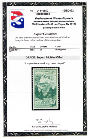 1011, Mint NH 3¢ Superb With PSE Graded 98 Certificate * Stuart Katz