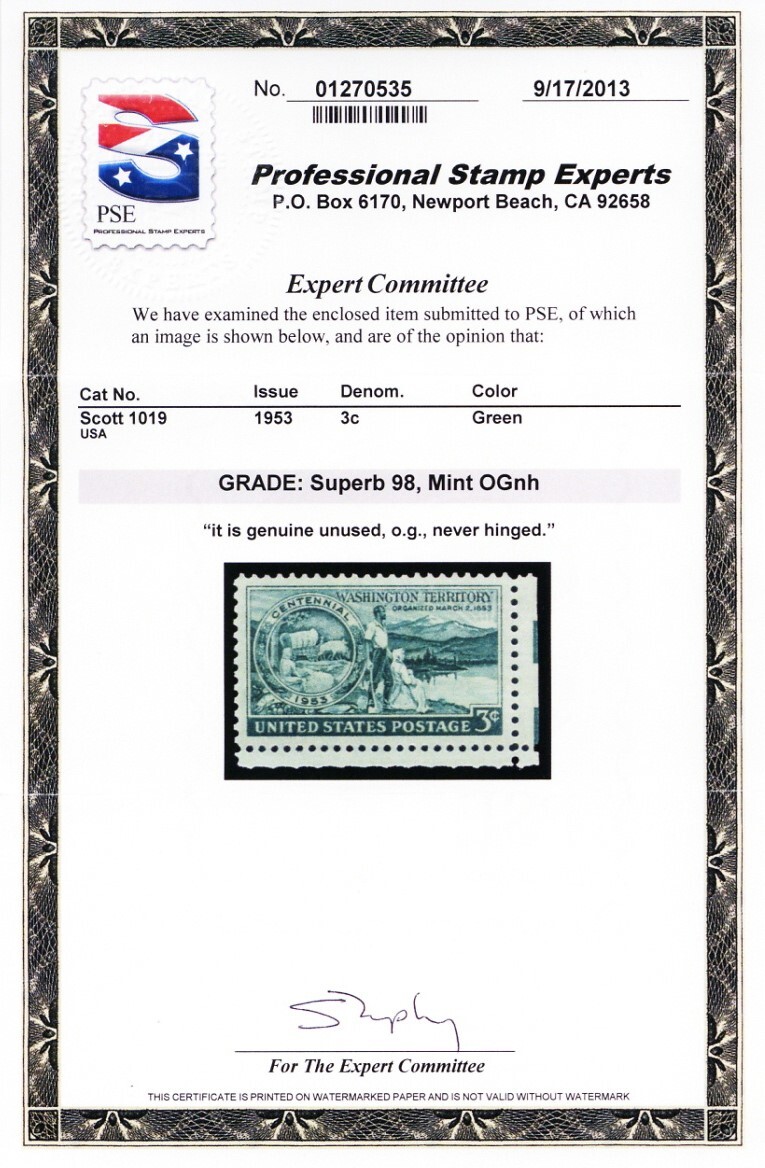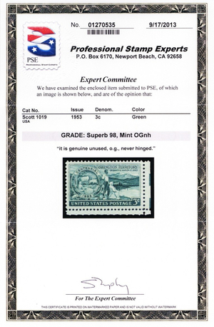 1019, Mint Superb NH 3¢ - PSE Graded 98 Certificate - Stuart Katz