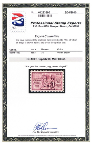 1020, Mint Superb NH 3¢ - PSE Graded 98 Certificate - Stuart Katz