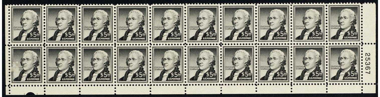 1053, Mint VF/XF NH $5 Plate Block of 20 Stamps CV $970 * Stuart Katz
