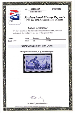 Due to the high cost of obtaining certificates we will only refund the cost of the stamp and not the cost of the certificate for stamps that sell for less than $250 that come back with a negative certificate. Stamps that sell for above $250 will receive a full refund for both the price of the stamp and cost of the certificate if it should come back not as described. For U.S. stamps only certificates from either APS, PSE or from the Philatelic Foundation are accepted, however "graded" certificates or "encased" items are not accepted.