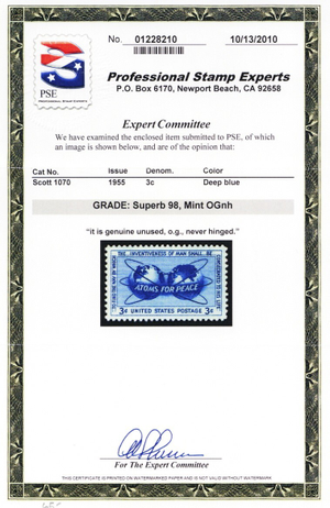 Due to the high cost of obtaining certificates we will only refund the cost of the stamp and not the cost of the certificate for stamps that sell for less than $250 that come back with a negative certificate. Stamps that sell for above $250 will receive a full refund for both the price of the stamp and cost of the certificate if it should come back not as described. For U.S. stamps only certificates from either APS, PSE or from the Philatelic Foundation are accepted, however "graded" certificates or "encased" items are not accepted.