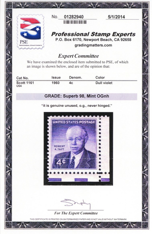 Due to the high cost of obtaining certificates we will only refund the cost of the stamp and not the cost of the certificate for stamps that sell for less than $250 that come back with a negative certificate. Stamps that sell for above $250 will receive a full refund for both the price of the stamp and cost of the certificate if it should come back not as described. For U.S. stamps only certificates from either APS, PSE or from the Philatelic Foundation are accepted, however "graded" certificates or "encased" items are not accepted.