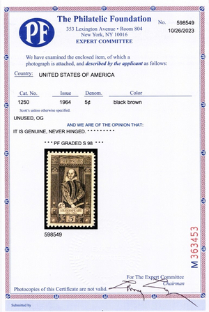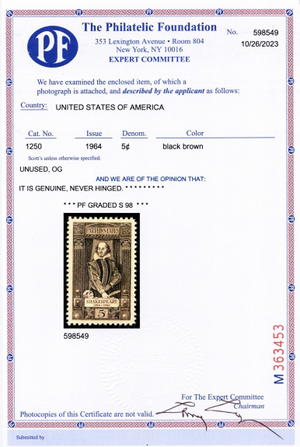 Due to the high cost of obtaining certificates we will only refund the cost of the stamp and not the cost of the certificate for stamps that sell for less than $250 that come back with a negative certificate. Stamps that sell for above $250 will receive a full refund for both the price of the stamp and cost of the certificate if it should come back not as described. For U.S. stamps only certificates from either APS, PSE or from the Philatelic Foundation are accepted, however "graded" certificates or "encased" items are not accepted.