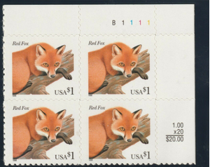 3036, $1 Red Fox Plate Block of Four Stamps Mint NH - Stuart Katz