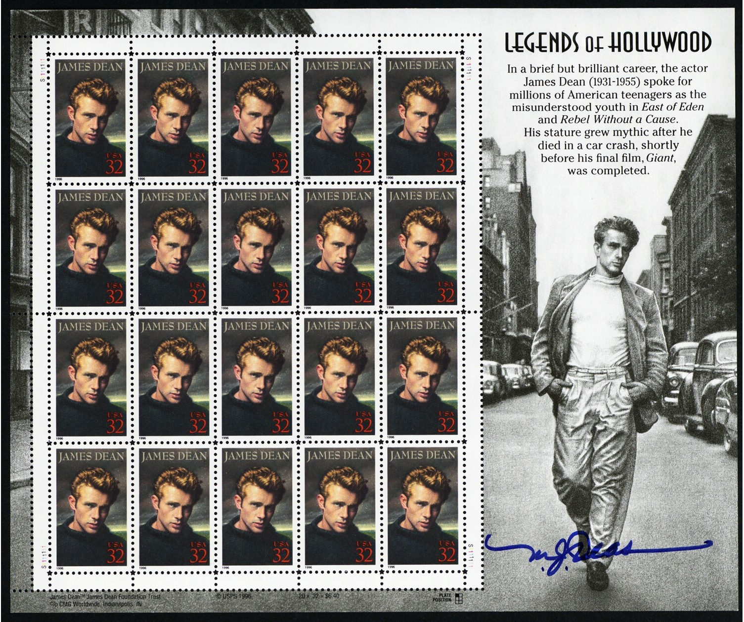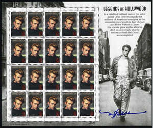3082, Mint NH 32¢ James Dean Sheet with Designers Autograph * Stuart Katz