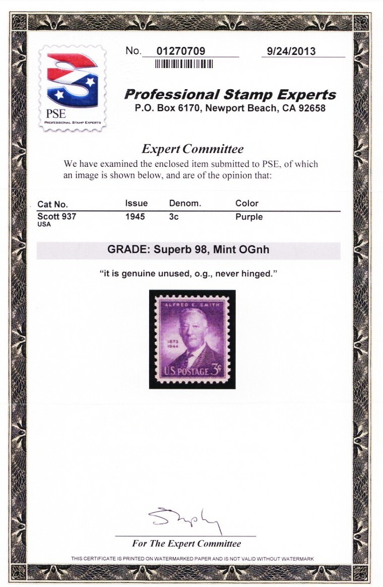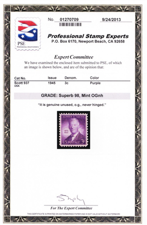 Due to the high cost of obtaining certificates we will only refund the cost of the stamp and not the cost of the certificate for stamps that sell for less than $250 that come back with a negative certificate. Stamps that sell for above $250 will receive a full refund for both the price of the stamp and cost of the certificate if it should come back not as described. For U.S. stamps only certificates from either APS, PSE or from the Philatelic Foundation are accepted, however "graded" certificates or "encased" items are not accepted.